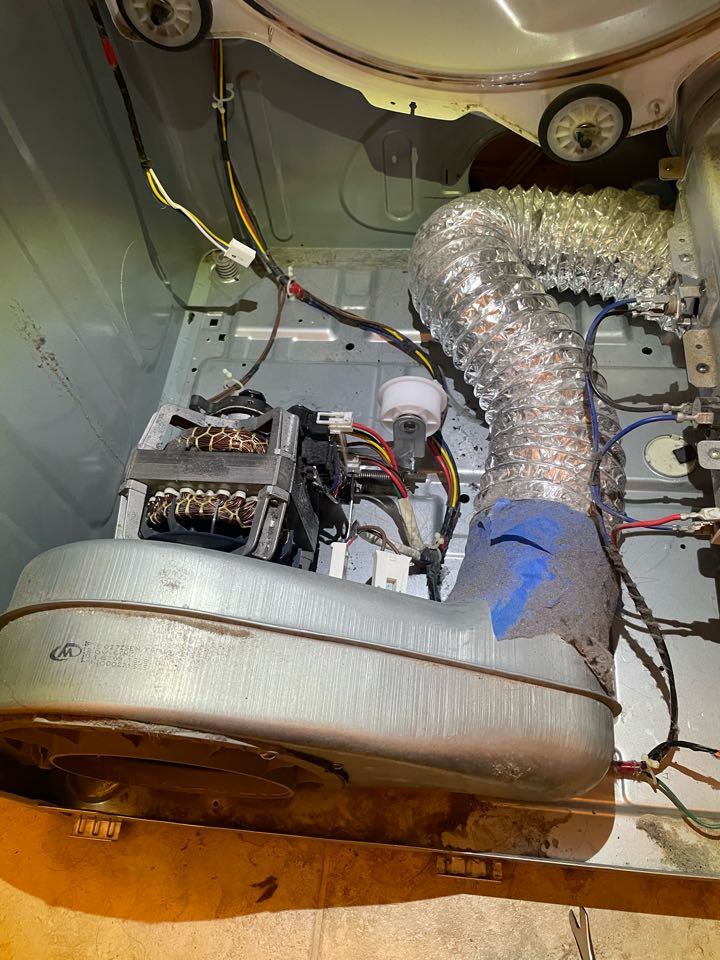 Maytag Bravos XL dryer that was making a loud noise. Upon inspection, I found that the heater housing and exhaust tube were loose. I secured them using high-temperature metal tape, which resolved the issue.