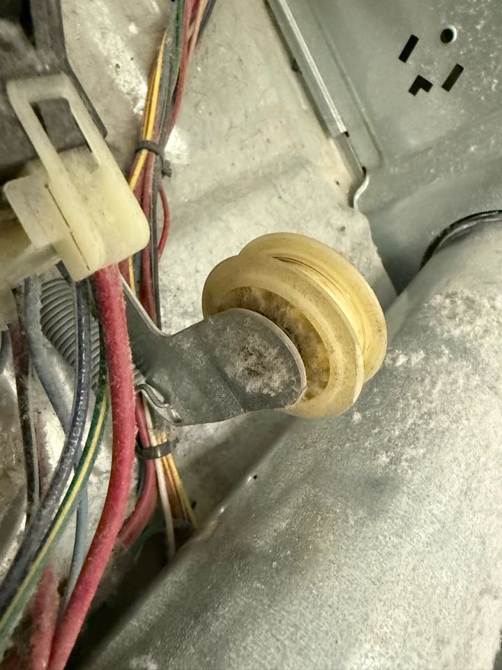 Maytag dryer that was making a high-pitched noise. After inspecting the dryer, I determined that one of the drum support roller bushings was worn out and causing the issue. To be safe, I replaced the 4-wheel maintenance kit to help the dryer last longer. After testing the dryer, I was able to confirm that the noise was gone.