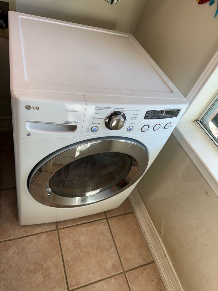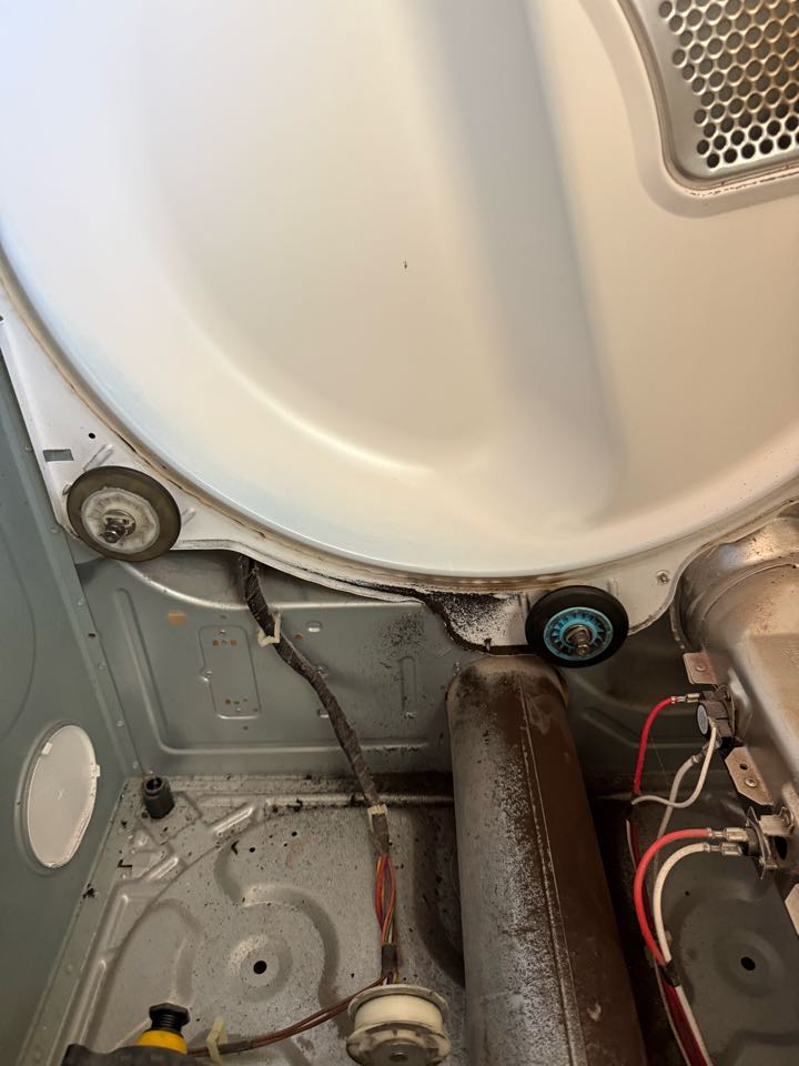 LG dryer that was making a loud noise as it ran. Upon further inspection, I determined that one of the drum support rollers was worn out and causing the noise. I recommended replacing all the 4 roller assemblies to prevent future issues. Additionally, the drive belt was also dried up and cracking, so I replaced all four dryer support rollers and drive belt. After testing the dryer, it is now sounding as intended.