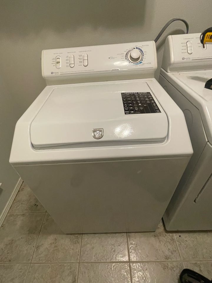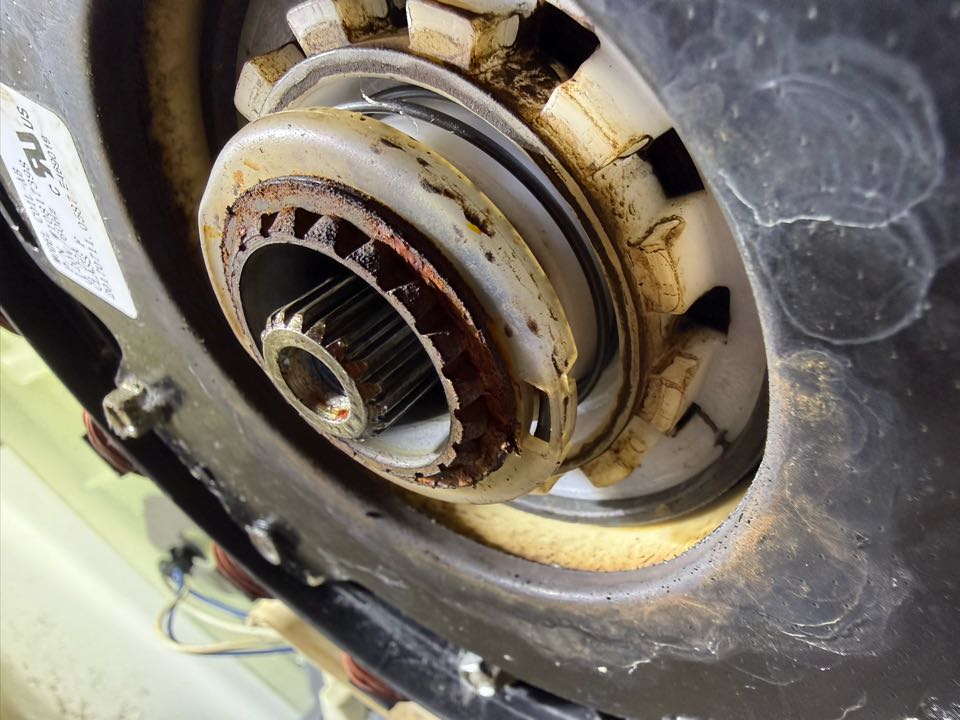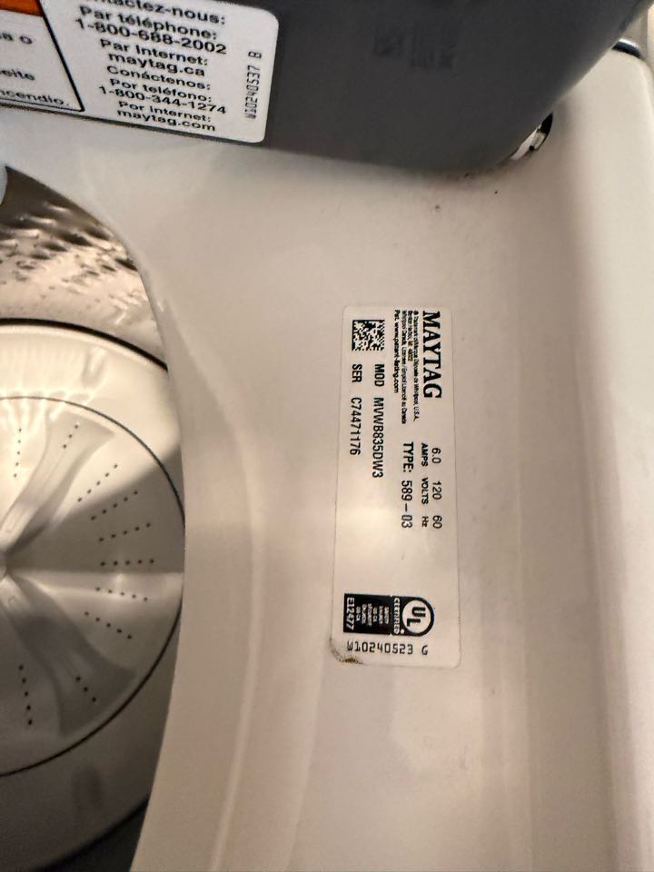 Maytag top load washer sounds like a jet engine when it is spinning. I determined the bearings seal has worn out and is allowing water to leak on to the bearings causing them to rust. The gear case will need to be replaced due to the bearings being built in to it. Slider is also worn and will need to be replaced.
