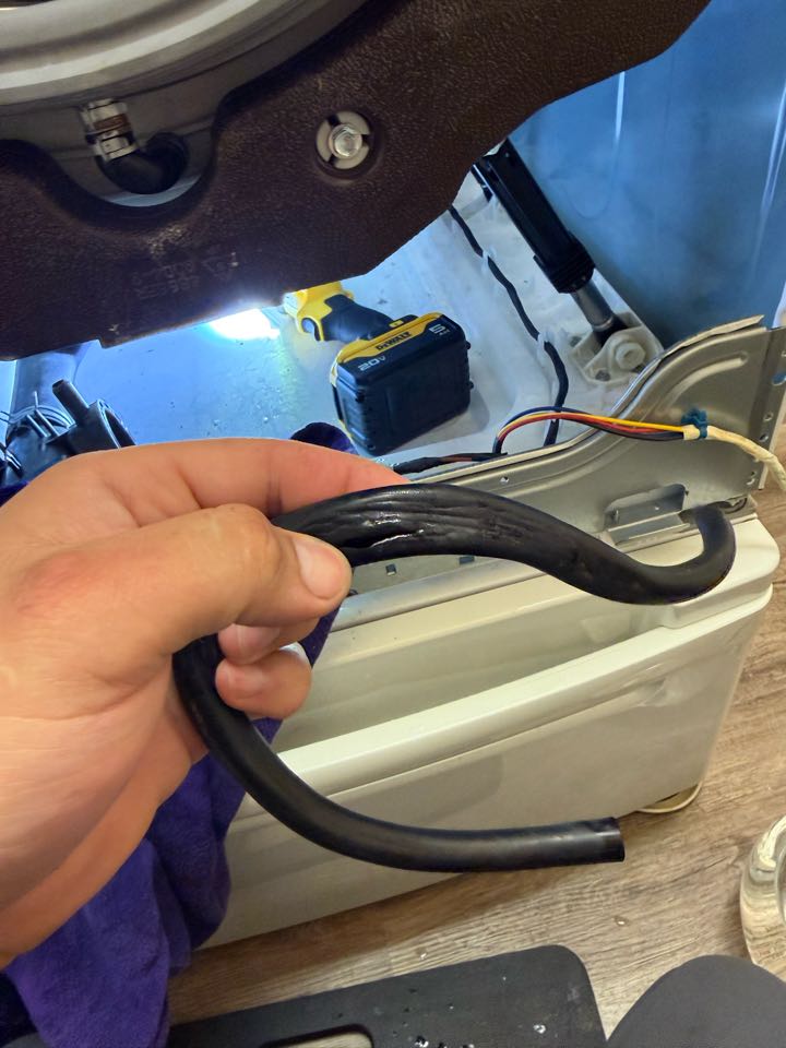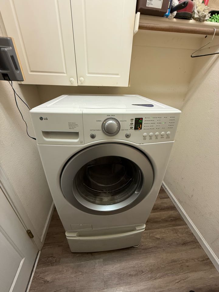 LG front load washer that was leaking water from the bottom. Upon inspection, I found that the manual drain hose that connects to the drain pump had worn out and developed a hole, causing water to leak. I replaced the hose and tested the washer, and it was no longer leaking.