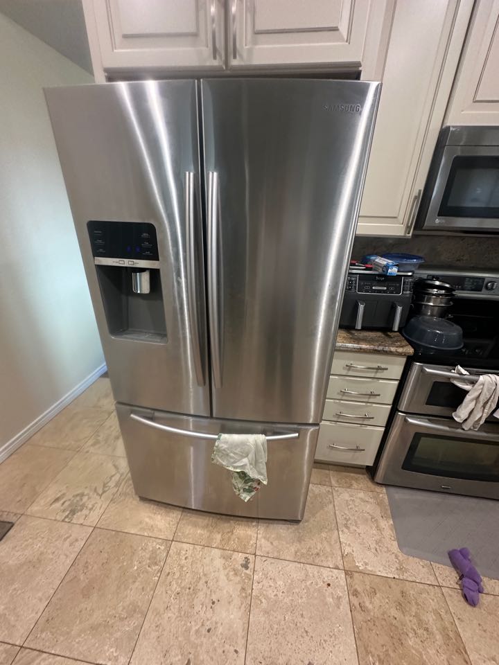Customers fridge was leaking water everytime you asked the dispenser for water. After further diagnose it comes to be that unit is getting too hot and melting a water line. Will need a compressor replacement so Customer decided to go with a new fridge. We offered are Customer a fridge that we have back at the shop with warranty and install. Customer agreed and we hauled the old unit away